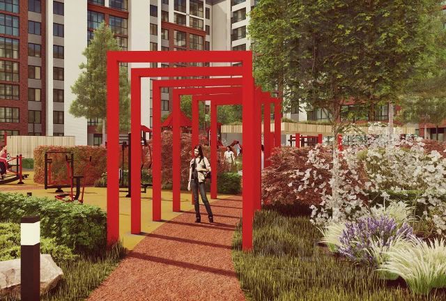 Внутренний двор, закрытый от машин, будет благоустроен в пейзажном стиле. Вместо асфальта здесь появятся газоны с всесезонными растениями и ландшафтные композиции с деревьями и кустарниками. В центре двора — игровые и спортивные площадки с безопасным покрытием и современным оборудованием, а также прогулочные зоны для отдыха с беседками.