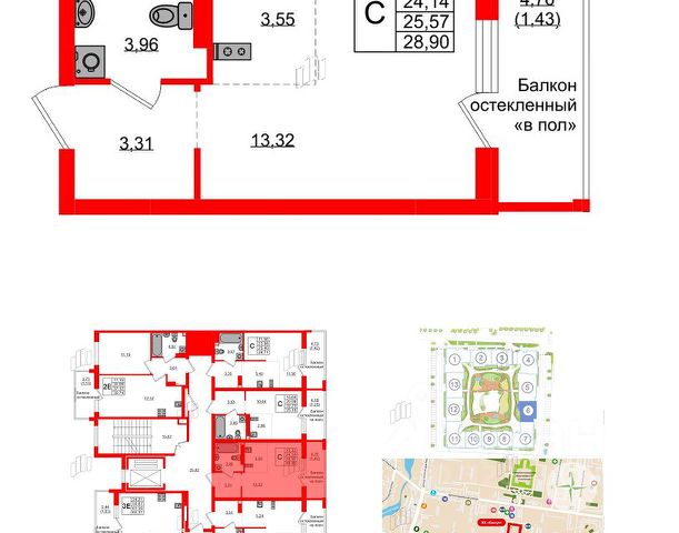 Общая площадь объекта по полу 28.96 м2 (с учётом остеклённого балкона - 4.76 м2), кухонной зоны 5.21 м2 и жилой зоны 11.56 м2.