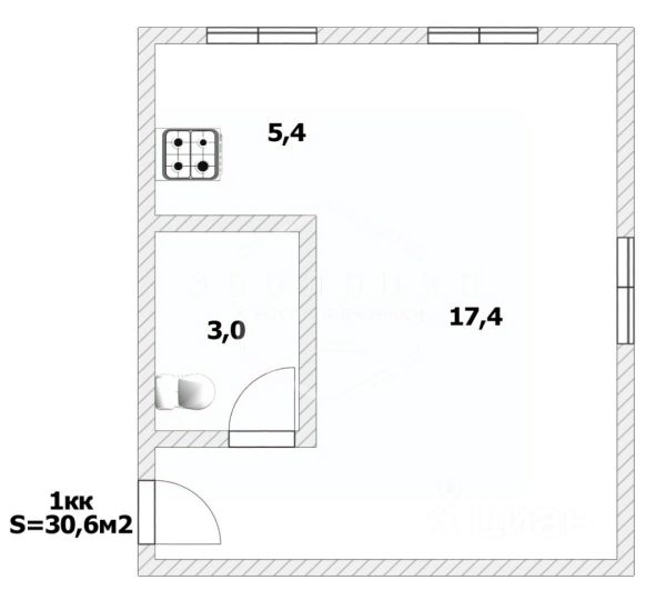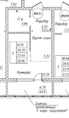 Общая площадь объекта по полу 28.96 м2 (с учётом остеклённого балкона - 4.76 м2), кухонной зоны 5.21 м2 и жилой зоны 11.56 м2.