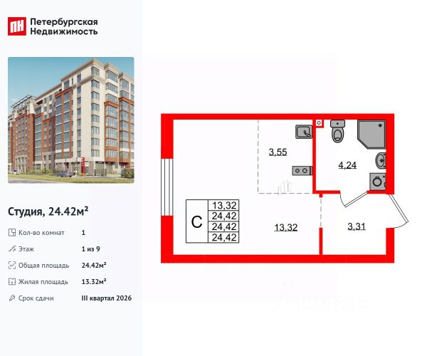 • ✓ В базе Циан 17 квартир-студий в кирпично-монолитном доме в районе Ленинградский в городе Калининград