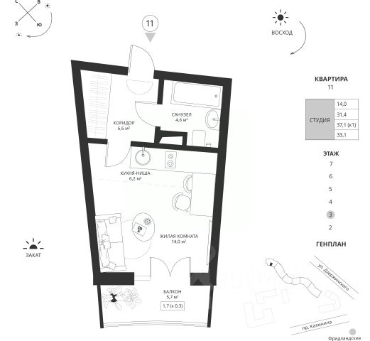 • ✓ В базе Циан 115 квартир-студий в кирпично-монолитном доме на проспекте Калинина в городе Калининград