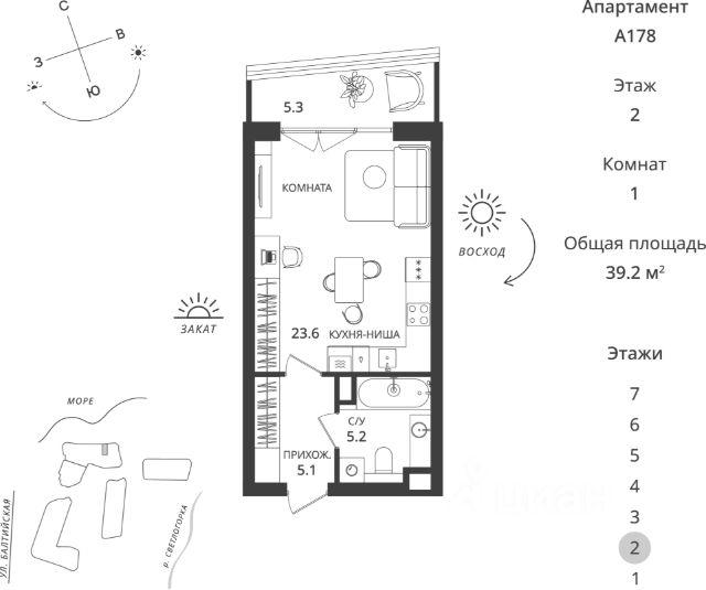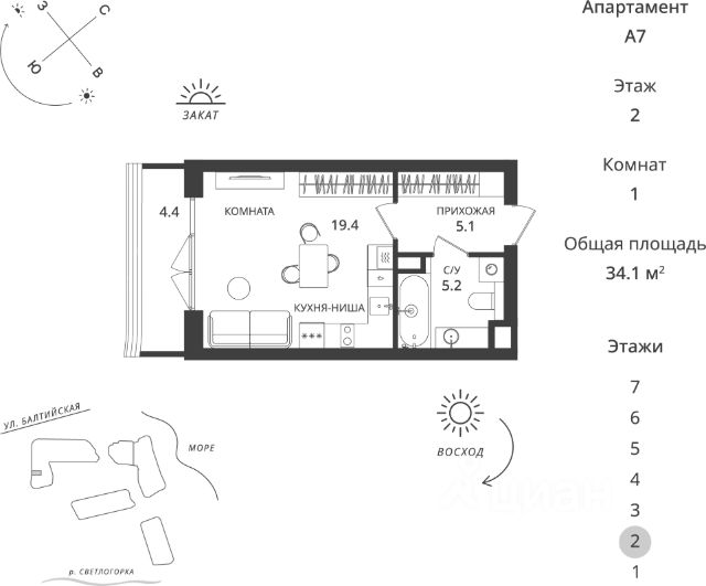 Продаётся светлая квартира-студия, где всё продумано для вашего максимального комфорта! Идеально для инвестиций или квартиры для себя. Мебель и техника остается по договоренности! Ориентиры: ул. Цветочная, Яблоневая, Тихая, Молодёжная, ФОК О Квартире: +Автономное газовое отопление с двухконтурным котлом обеспечивает тепло, уют и экономию на коммунальных платежах. +Кухня, продуманная до мелочей, качественная фурнитура, много мест хранения и обеденная зона +Удобный, компактный диван +Прекрасный вид из окна +Открытый балкон - много свежего воздуха +С/у в плитке с душевой кабиной +Качественный ламинат +можно преобрести подвал за дополнительную плату! О доме: -дом 2019 года, с закрытой охраняемой территорией с откатными воротами, -четыре выхода с кодовыми замками. -собственная наземная парковка -во дворе детская площадка, где будет безопасно гулять ребёнку Район, инфраструктура: Светлогорск-1 лучший район города для жизни и отдыха! Всё в шаговой доступности: Крупные магазины Спар, Виктория+аптеки пешком 6 мин Мини-рынок со свежими фермерскими продуктами 10 мин Озон 3 мин ВБ 5 мин Остановка 6мин ФОК - находится буквально в 2х минутах от дома. Спортивно-оздоровительный комплекс с футбольным полем, беговыми дорожками, ледовым катком, бассейном и тренажёрным залом предлагает занятия для детей и взрослых. Здесь найдутся секции гимнастики, танцев, а также квалифицированные тренеры по различным направлениям. Удобная транспортная доступность: за 40 минут на электричке или за полчаса на машине по скоростной трассе можно добраться до Калининграда 7 минут до Пионерского 35 минут до Зеленоградска Особого внимания заслуживает природное окружение. В нескольких минутах от дома — живописный сосновый парк с зонами отдыха, где можно провести время с семьёй или друзьями, наслаждаясь прогулками и видами на озеро Тихое. А до Балтийского моря всего 20 минут пешком или 5 минут на общественном транспорте. Без обременений, быстрый выход на сделку. Квартира идеально подходит для инвестиций и собственного проживания! Звоните, договоримся о просмотре в любое время! Номер объекта: #1/543703/18158