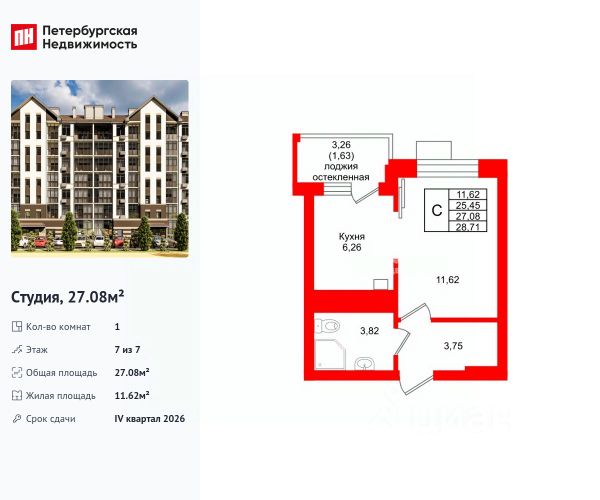 Продается просторная студия от застройщика в жилом комплексе "Лэйк Сити" в Светлогорске. Удобная, классическая, функциональная европланировка, большая кухня-гостиная 6.26 м², просторная прихожая 3.75 м². Общая площадь студии - 27.08 м², жилая 11.62 м², высота потолка 3.3 м. Квартира продается с отделкой "Серый ключ ЛС". Что особенного в ЖК "Лэйк Сити"? • Велодорожка вдоль берега озера • Детские и спортивные площадки, уютные места для отдыха • Дома высотой 7-8 этажей • Магазины, кафе и аптеки на первых этажах домов • Потрясающие виды на воду и Светлогорский лес • Собственный солярий на крыше (за исключением дома 8) • Уникальное расположение- на берегу озера Тихое