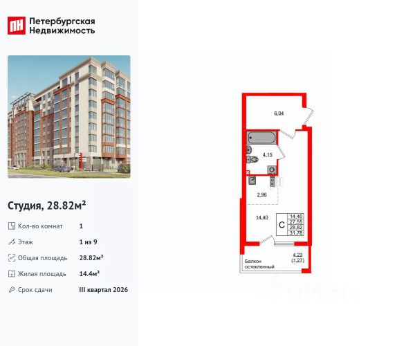 Общая площадь объекта по полу 28.96 м2 (с учётом остеклённого балкона - 4.76 м2), кухонной зоны 5.21 м2 и жилой зоны 11.56 м2.