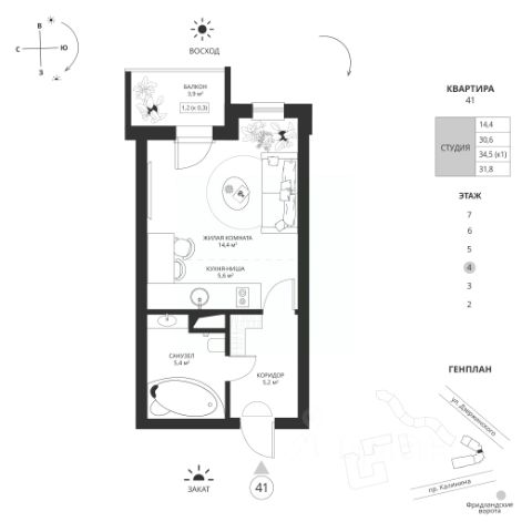 Квартира 375. ЖК "Альпенштадт" это новая история, которая начинается с вашего выбора прямо сейчас. Чистый воздух и природная красота будут сочетаться здесь с городским комфортом проживания. Все необходимое для повседневной жизни рядом. Инфраструктура комплекса дополняет развитую инфраструктуру района. Транспортная доступность, 7 минут до центра города, удобный выезд к морю, рядом остановки общественного транспорта. В этом жилом комплексе вам понравится: - авторская архитектура; - дизайнерское оформление входных групп и мест общего пользования, - автономное отопление; - новейшие детские и спортивные площадки; - двор "без машин" и благоустройство территории; - подземный паркинг с системой вентиляции, пожаротушения и охраны; - передовые технологии пожарной безопасности и видеонаблюдения, умный домофон "Спутник" с мобильным приложением. Эргономичные и продуманные планировки с просторными кухнями-гостиными и гардеробными, системами хранения, мастер-спальнями. Квартира полностью подготовлена к финишной отделке: - стяжка пола под напольное покрытие; - высокое качество штукатурки стен под покраску или поклейку обоев, - входная дверь высокого класса, - автономное отопление с установкой котла и радиаторов. - система электропроводки, выключатели и розетки. Чистовая отделка от КСК. Включите стоимость ремонта в ипотечный кредит, выплачивайте удобными платежами и получите готовую квартиру для жизни при выдаче ключей. В каждом подъезде предусмотрены места для хранения велосипедов и колясочные, кладовые помещения на цокольных этажах. ОТ НАС - полное сопровождение сделки: помощь в подборе квартиры, оказание юридического сопровождения, а также самые выгодные условия ипотечного кредитования (реализация субсидий, мат. капитала, льготная ипотека с гос. поддержкой). Звоните, будем рады помочь осуществить Вашу мечту! Продается квартира-студия от застройщика в Калининграде.