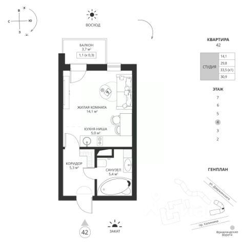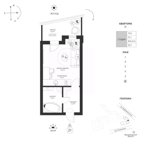 Квартира 137. Жилой комплекс Левада это место, где комфорт встречает функциональность, а стиль несет в себе простоту и уют. Комплекс расположен в Московском районе Калининграда в максимальной близости к центру, визуально соединяя исторические сложившиеся части города северную и южную. 5 минут до центра города. Насыщенный инфраструктурой район включает в себя большое количество школ и детских садов, а близость парка Южный создает повод для прогулок и семейного отдыха. В этом жилом комплексе вам понравится: - идеальная локация для жизни в южной части города; - авторская архитектура; - оформление входных групп и мест общего пользования, - автономное отопление; - передовые технологии пожарной безопасности и видеонаблюдения, умный домофон "Спутник" с мобильным приложением. В центре комплекса расположен пруд, вокруг которого будет организована благоустроенная точка притяжения жителей всего комплекса, с большой детской и спортивной площадкой и зоной отдыха для взрослых. Квартира полностью подготовлена к финишной отделке: - стяжка пола под напольное покрытие; - высокое качество штукатурки стен под покраску или поклейку обоев, - входная дверь высокого класса, - автономное отопление с установкой котла и радиаторов. - система электропроводки, выключатели и розетки. Чистовая отделка от КСК. Включите стоимость ремонта в ипотечный кредит, выплачивайте удобными платежами и получите готовую квартиру для жизни при выдаче ключей. ОТ НАС - полное сопровождение сделки: помощь в подборе квартиры, оказание юридического сопровождения, а также самые выгодные условия ипотечного кредитования (реализация субсидий, мат. капитала, льготная ипотека с гос. поддержкой). Звоните, будем рады помочь осуществить Вашу мечту! Квартира-студия от застройщика в районе Московский в городе Калининград.