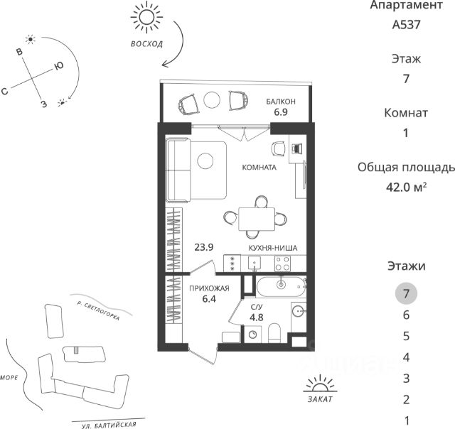 Представляем вам уникальный проект в Светлогорске жилой комплекс "Морская нота". Это место, где природа и комфорт сливаются в единую симфонию, создавая идеальные условия для жизни и отдыха. Архитектура и удобства Комплекс состоит из 16 пятиэтажных домов, каждый из которых оснащен лифтом для вашего удобства. Мы позаботились о создании безбарьерной среды, чтобы каждый житель чувствовал себя комфортно. В домах предусмотрено автономное отопление, что гарантирует тепло и уют в любое время года. Разнообразие планировок В первом доме ЖК "Морская нота" представлены уютные студии и однокомнатные квартиры различных планировок. Просторные открытые балконы и остекленные лоджии позволяют наслаждаться свежим морским воздухом и потрясающими видами на окрестности. Идеальное расположение Комплекс расположен в непосредственной близости к морю, что позволяет вам ежедневно наслаждаться музыкой волн и свежестью бриза. Отличная транспортная доступность обеспечивает легкий доступ ко всем необходимым объектам инфраструктуры города Светлогорска и города Калининграда. Безопасность и комфорт Ваша безопасность наш приоритет. Комплекс оборудован современными системами видеонаблюдения, чтобы вы могли жить спокойно и уверенно. Двор без машин обеспечивает безопасность ваших детей и спокойствие для всей семьи. Отделка Выполнена стяжка пола, оштукатурены стены. Разведённые коммуникации (электрика, вода, газ). Установлены счётчики, домофон. Квартира от застройщика Покупка квартиры напрямую от застройщика это гарантия качества и надежности. Мы предлагаем выгодные условия приобретения жилья в новостройках. При покупке квартир в данном ЖК вы можете использовать любые сертификаты и любые ипотечные программы (семейная, IT). Так же вы можете воспользоваться беспроцентной рассрочкой от застройщика. В продаже имеются кладовые помещения Откройте для себя жизнь у моря с жилым комплексом "Морская нота" здесь каждая деталь продумана для вашего комфорта! *условия по рассрочке уточняйте у менеджера.