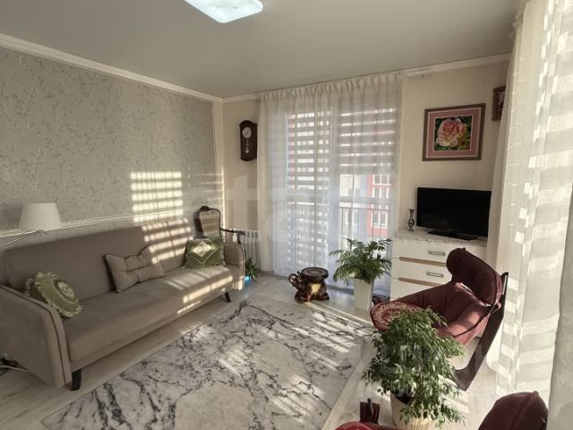 Продается чистая, светлая и уютная 1-комнатная квартира на 5-м этаже 9-ного дома. Сторона света - юго-запад. Вид из окна во двор, расстояние между близлежащими домами достаточно большое. Квартира никогда не сдавалась. Продается полностью укомплектованная, готовая для комфортной жизни. Вся мебель и техника остается новым хозяевам) Имеется несколько спальных мест - раскладной диван и кровать, которая убирается в шкаф. Также есть тех.возможность в комнате подвесить детскую качель. На кухне продумано выдвигающееся продление рабочей поверхности, что очень удобно при готовке. Кухонный стол раскладывается. На лоджии сделаны полки под хранение запасов. В прихожей имеется зона хранения под зеркалами. Две входные двери. Отопление центральное. Дом расположен в удобной локации. Рядом, в 2 минутах автобусная остановка. В 5 минутах новым продуктовый магазин СПАР. Также в непосредственной близости кафе, различные магазины, спорт-комплекс Вива, заправки. В 5 минутах ходьбы через соседний двор находятся детский сад и школа. Мимо дома проходит вело-дорожка, парковка во дворе. Также недалеко находятся поликлиника, прогулочная зона Летнего озера, Понарт. Продажа от собственника (адекватный молодой мужчина). Без проблем и обременений. Срок владения - 13 лет. Из минусов - длинный коридор (гостиного типа) и старый дом 1985 года постройки.