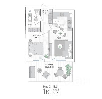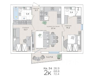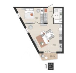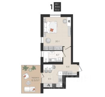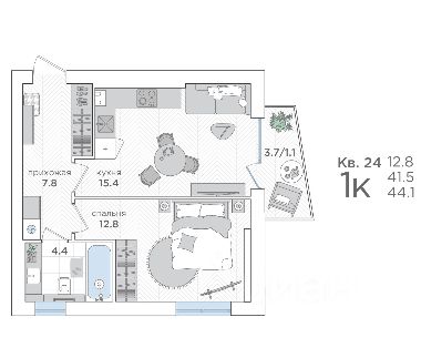 • Просторная кухня-гостинaя 12,2 м²;