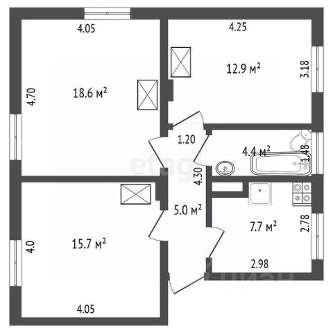 Совмещённый санузел (5 м²), оборудован ванной. В ванной установлен полотенцесушитель.