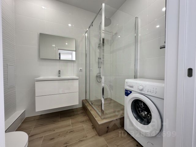 Санузел: стиральная машина с сушкой LG (на гарантии до декабря 2026), душ и ванна, раковина с зеркалом, подвесная тумба, пенал для хранения, стеллаж.