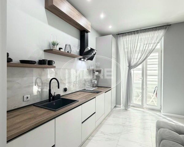 Встроенная кухня со стильными фасадами и столешницей под дерево, в наличии вся необходимая техника — индукционная варочная панель, вытяжка, микроволновая печь, электрический чайник, холодильник, стиральная машина.