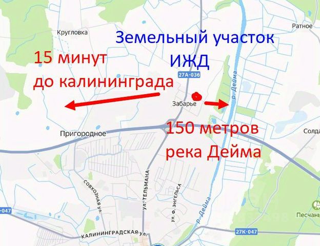 Предлагаем к продаже земельный участок 9 соток в п.Забарье в 300 метрах от реки Дейма. Это место где можно отдохнуть от городской суеты, насладиться природой, при этом в 3-х минутах находятся супермаркеты, школы, детские сады,ФОК. До Калининграда 15-20 минут по трассе. Участок ровной формы, на возвышенности, сухой. Рядом живут соседи. Вдоль участка проходит дренаж, что позволит подключить септик. Столбы для электричества примыкают к участку. Это позволит быстро построить дом! Поселок быстро развивается, сейчас в нем около 50-ти новых домов! с удовольствием организуем показ объекта, в том числе онлайн! Номер объекта: #1/537163/24344