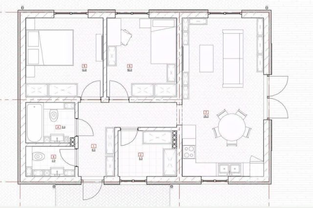 I-й ЭТАЖ: большое крытое крыльцо, прихожая, коридор, две раздельные спальные комнаты, санузел с внешним окном, просторная кухня-гостиная -26 кв.м с большим окном и панорамным выходом на придомовую территорию (террасу). Возможность использования мансардного пространства и окна для "второго света" в гостиной: это позволяет объединить пространство, увеличить приток естественного света и визуально расширить помещение.