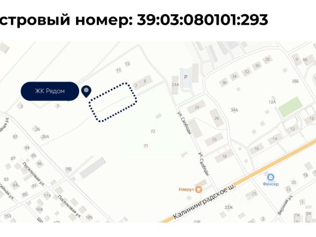 Код объекта: 2050041. Отдел загородной недвижимости предлагает к продаже земельный участок, расположенный по адресу: Калининградская область, п.Шоссейное, ул.Венская, д.2. Ориентиры: ул.А.Суворова, ул.Тихая, ул.Варшавская. Характеристики участка: Размер участка 9,33 с. Назначение участка индивидуально жилищное строительство. Участок в собственности, квадратной формы, подсыпан. Свет и газ - по улице, подключение возможно. Местоположение: в непосредственной близости от крупной городской магистрали - ул.Суворова, в локации, где уже простроено много новых частных домов и живут люди. Подъездные пути - грунтовая дорога. Обременения не зарегистрированы. Межевание проведено. Ипотека на приобретение земельного участка и под строительство возможна. Характеристика поселка: Посёлок Шоссейное является одним из самых популярных для строительства индивидуальных жилых домов, находится практически в черте города Калининграда. Добраться можно автобусами 18, 19, 34, 117, 147, 161А в любую точку города. В Шоссейном есть своя школа и детский сад, продовольственные и продуктовые магазины, супермаркет "Пятёрочка", аптеки, кафе, ПВЗ WB и Ozon. Совсем рядом находятся Голубые озёра и Калининградский залив - излюбленные калининградцами зоны отдыха. Отдел загородной недвижимости исполняем мечты о собственном доме.