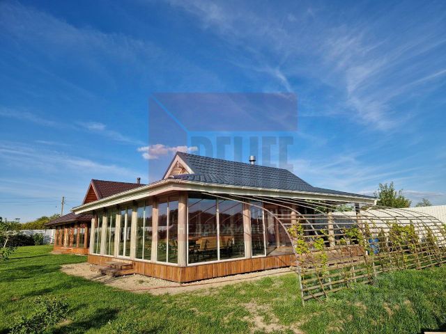 На участке отдельно стоящее здание, выполнено в одном стиле с основным домом. Имеет два помещения: летняя кухня (18 кв.) мангал, тандыр, газовый барбекю, горячая вода и отдельная комната для хранения садового инвентаря и инструментов (9 кв.), оборудована системой хранения. Теплица. Сборный домик (как дополнительное место хранения).
