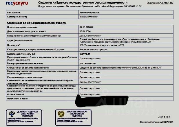 В продаже земельный участок , площадью 1580 квадратных метров, с кадастровым номером 39:18:090004:36. Находящийся по адресу; п. Взморье ул. Садовая 22 . На участке : газ; электричество; по документам дом( который при реконструкции , без проекта и разрешения на строительство , превратится в то о чем вы мечтали) Развитая инфраструктура! Рядом школа. До Калининграда 15 минут езды, до Светлого 10. Асфальт до участка.