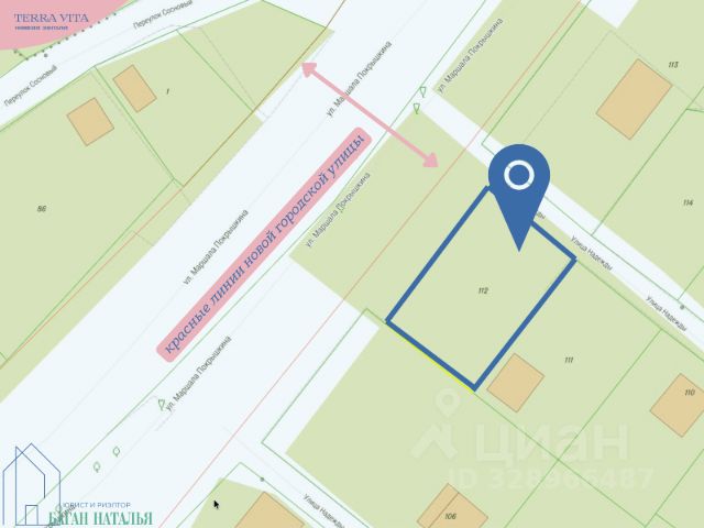 • участок находится на первой линии городской улицы маршала Покрышкина (проектируемое строительство), с тротуарами, городскими столбами освещения, остановками и благоустройством.