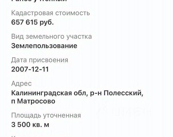 • ✓ В базе Циан 1 земельных участков в поселке Зорино Гвардейский муниципального округа