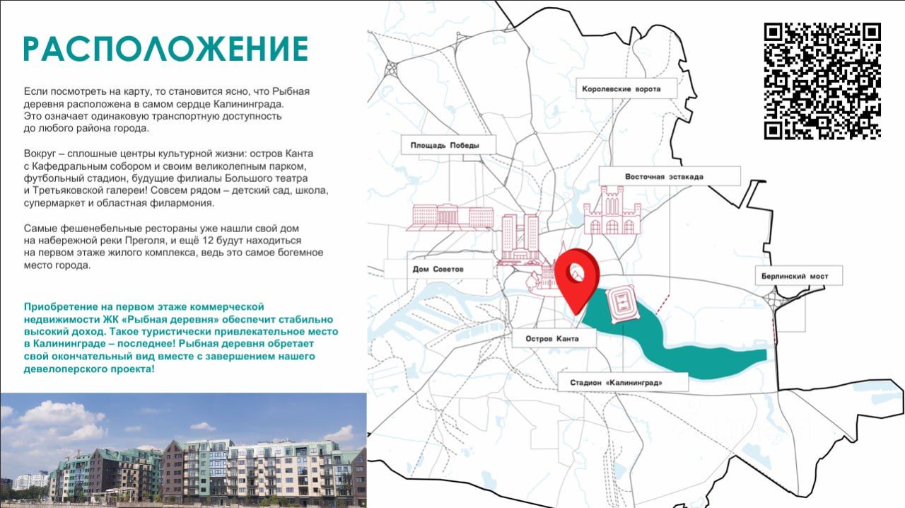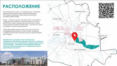 Расположен комплекс РЫБНАЯ ДЕРЕВНЯ в центре города Калининграда. Учитывая городскую планировку это обеспечивает одинаковую транспортную доступность до любого района города. В окружении туристических объектов: остров Канта с Кафедральным соборов, стадион Ростех Аренда, филиал Третьяковская галерея. Причальные стенки р. Прреголя для маломерных плавтехсредств.