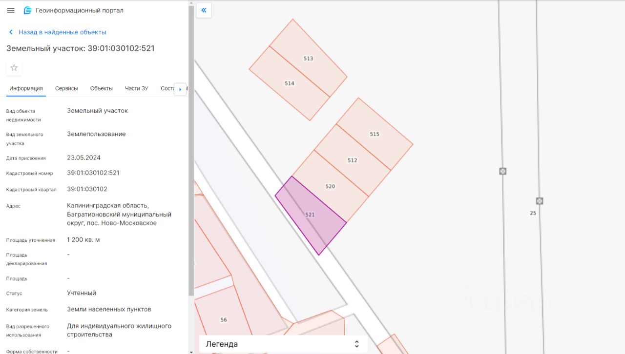Земельный участок с кадастровым номером 39:01:030102:521 площадь 1200 по адресу Калининградская область, Багратионовский муниципальный округ, пос. Ново-Московское