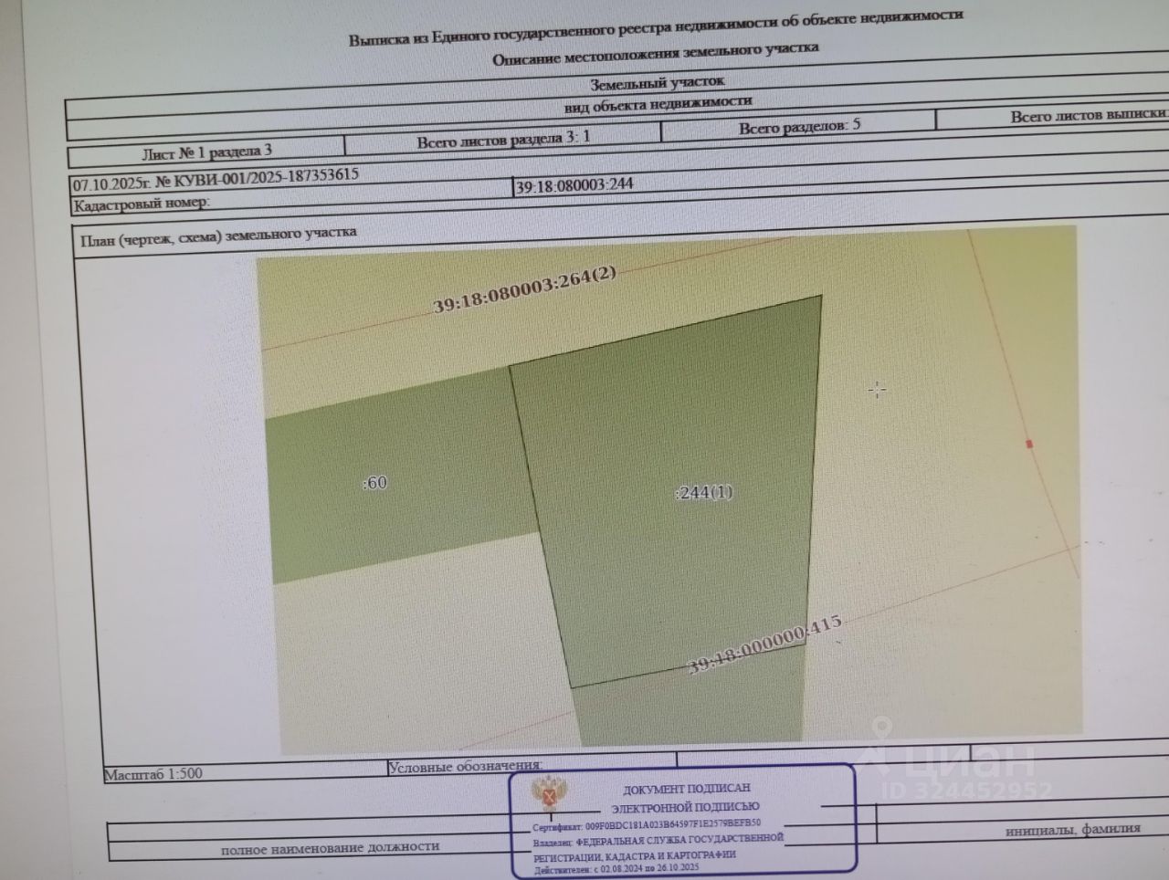 право заключения договора аренды земельного участка с КН 39:18:080003:244