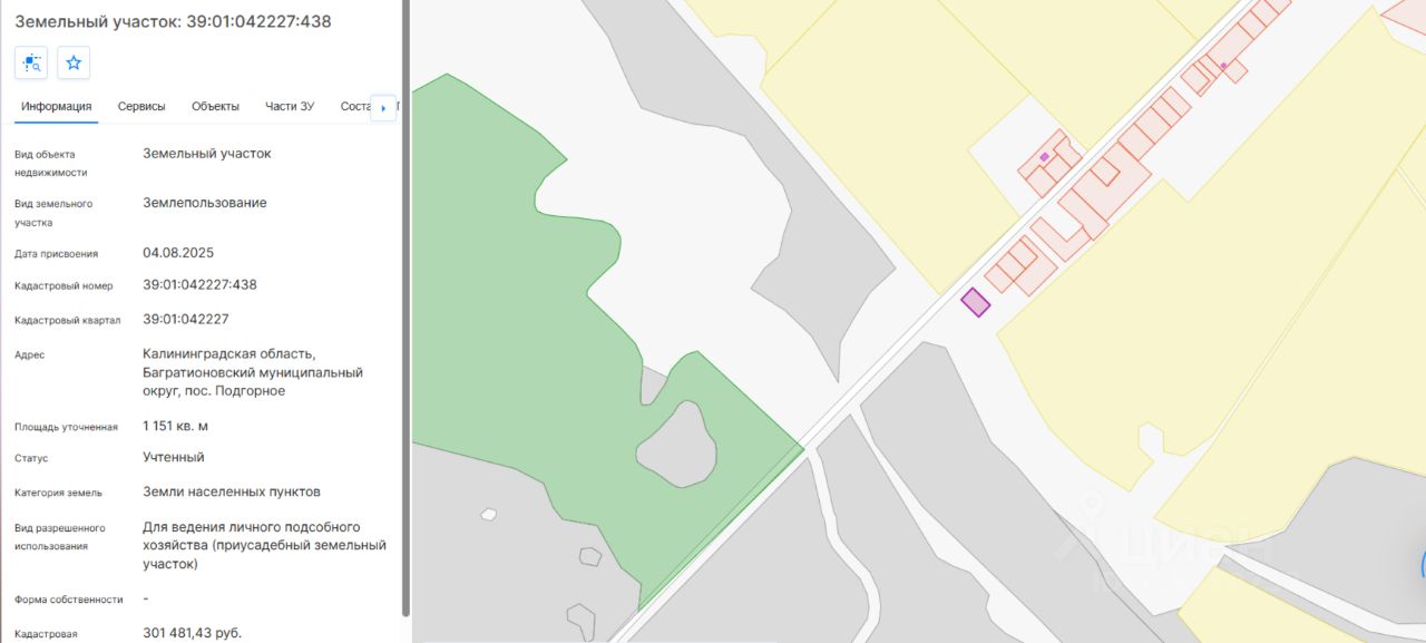 Земельный участок с кадастровым номером 39:01:042227:438, расположенный по адресу: Калининградская область, Багратионовский муниципальный округ, пос. Подгорное