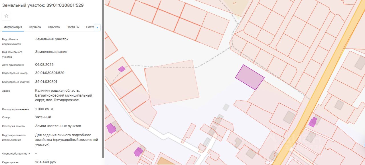 Земельный участок с кадастровым номером 39:01:030801:529, расположенный по адресу: Калининградская область, Багратионовский муниципальный округ, пос. Пятидорожное