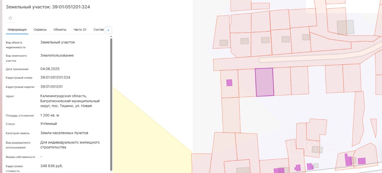 Земельный участок с кадастровым номером 39:01:051201:324, расположенный по адресу: Калининградская область, Багратионовский муниципальный округ, пос. Тишино, ул. Новая