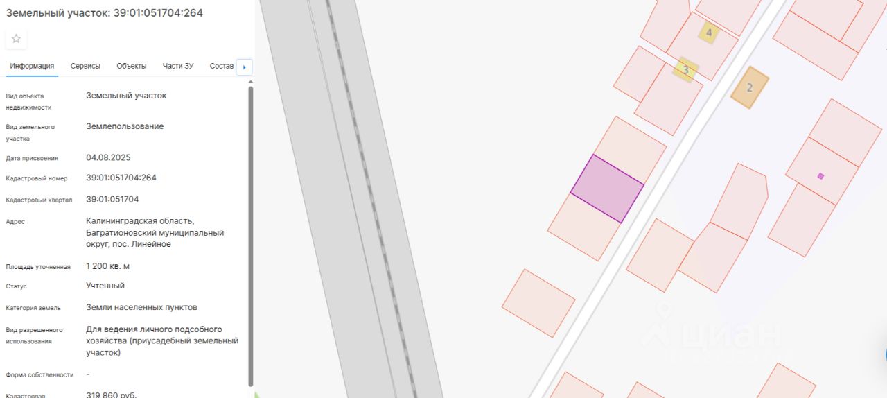 Земельный участок с кадастровым номером 39:01:051704:264, расположенный по адресу: Калининградская область, Багратионовский муниципальный округ, пос. Линейное