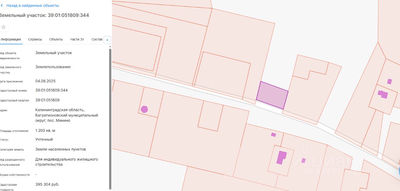 Земельный участок с кадастровым номером 39:01:051809:344, расположенный по адресу: Калининградская область, Багратионовский муниципальный округ, пос. Минино