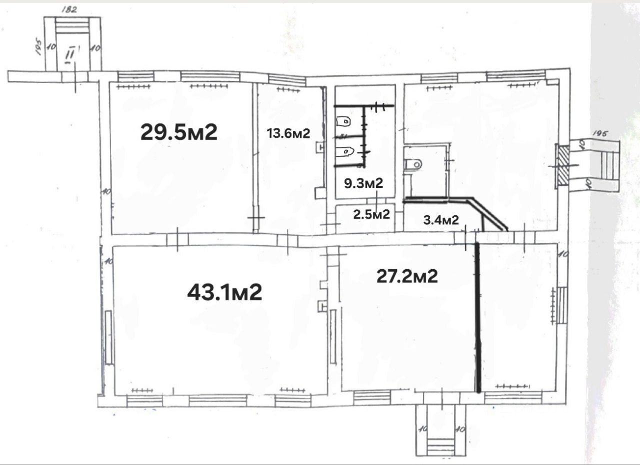 Состоит из трёх залов площадью 29,5 м2 , 43,1 м2 27,2 м2 и комнаты 13, 6 м2 , два сан узла , 4 мокрых точки. Сделан свежий качественный ремонт в светлых тонах по всему помещению.