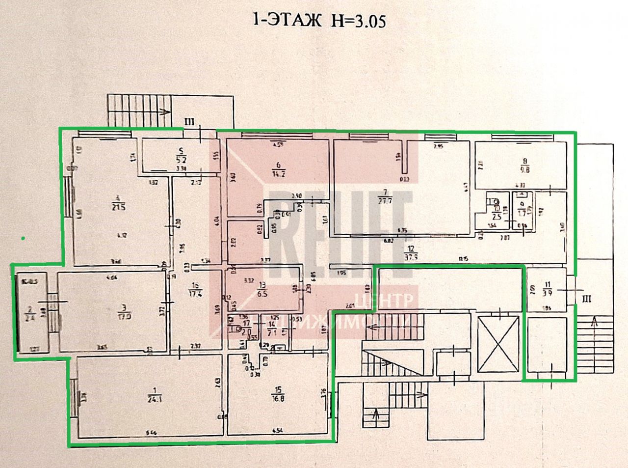 8 офисных просторных помещений правильной формы общей площадью 212,7 кв. м. расположенных на 1-ом этаже.
