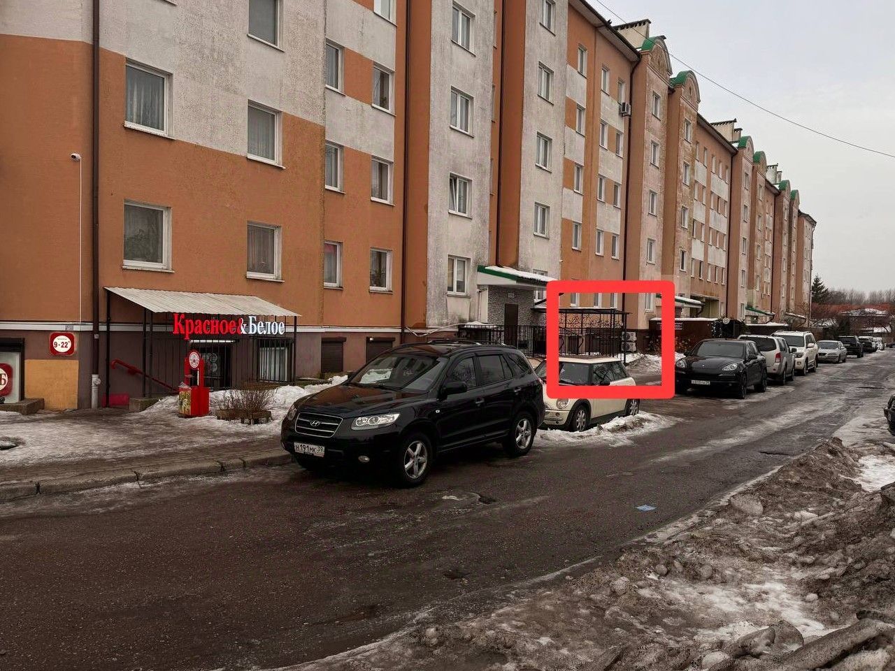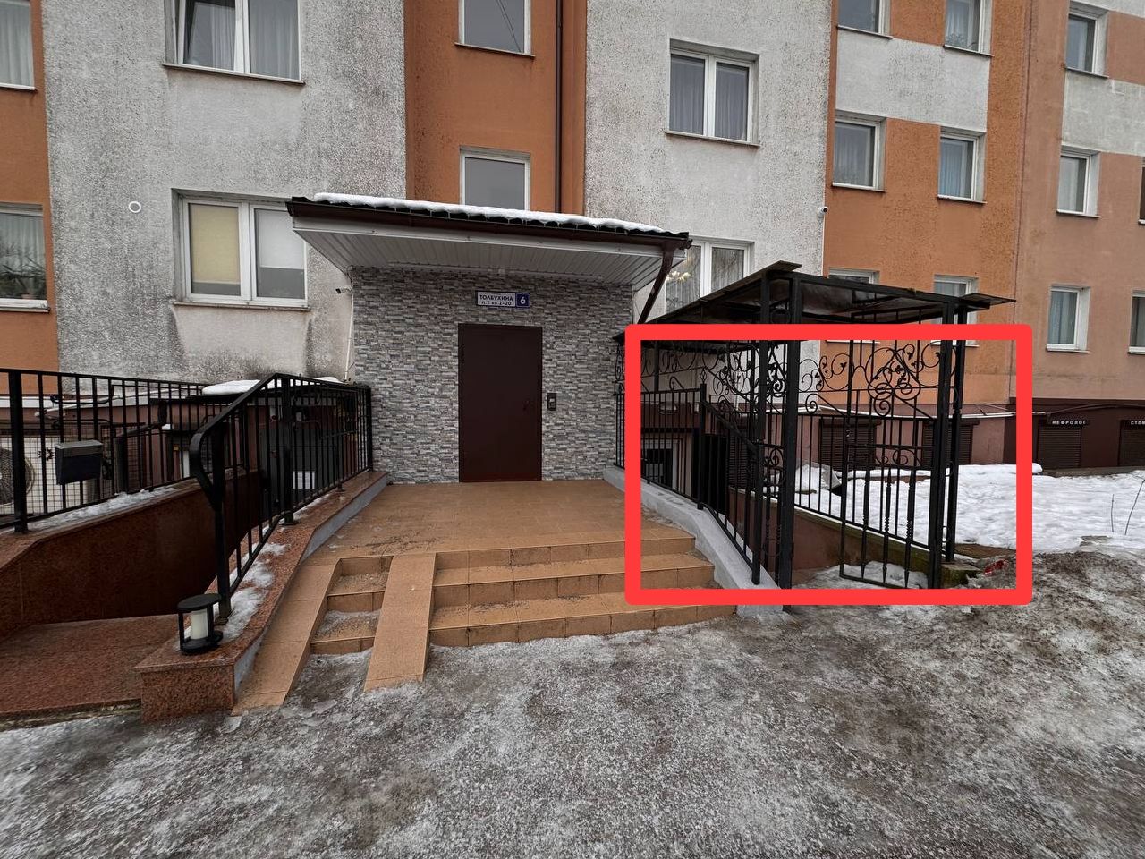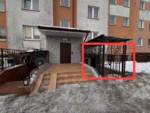 Парковка на улице рядом со входом, возможно для грузового транспорта.