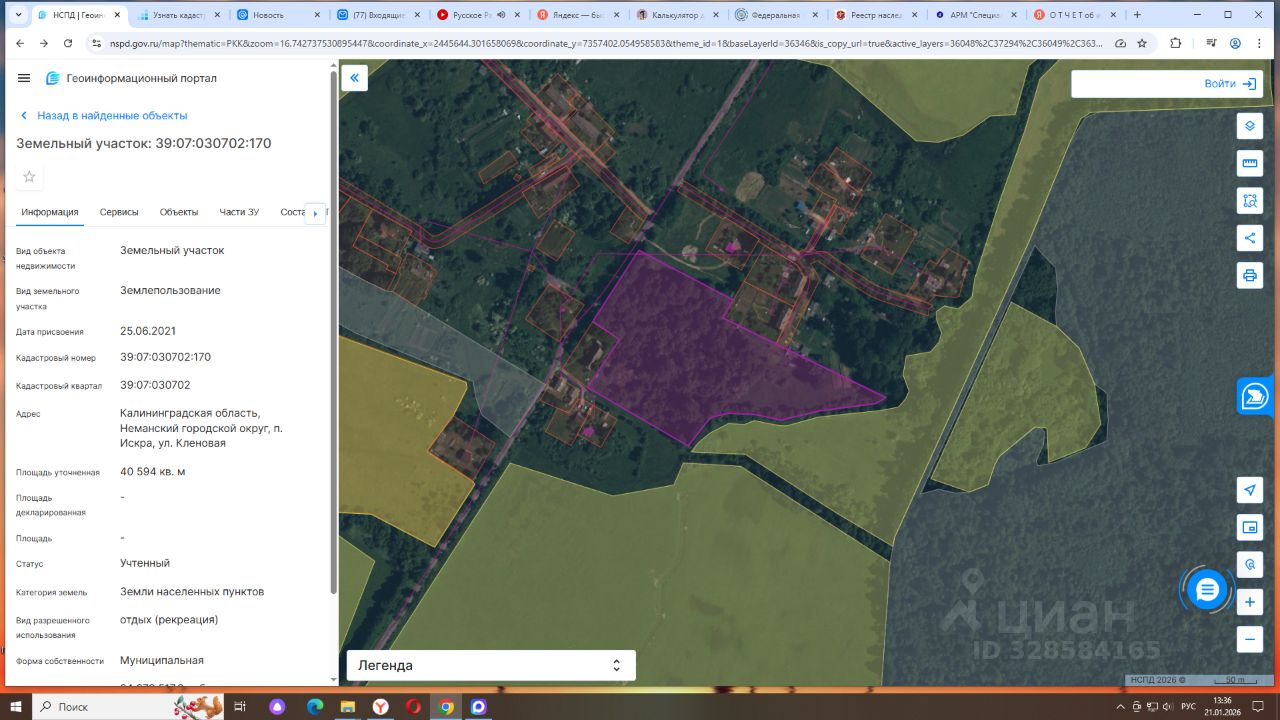 Земельный участок из земель населенных пунктов, находящийся в муниципальной собственности с кадастровым номером 39:07:030702:170, с разрешенным использованием: отдых (рекреация), площадью 40594 кв.м, адрес: Калининградская область, Неманский городской округ, п. Искра, ул. Кленовая