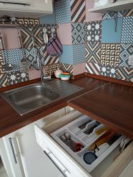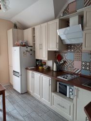 Холодильник, стиральная машина, утюг, небольшая духовая печь, телевизор, микроволновка, чайник, , гладильная доска, сушилка для белья. Вся необходимая посуда так же есть.