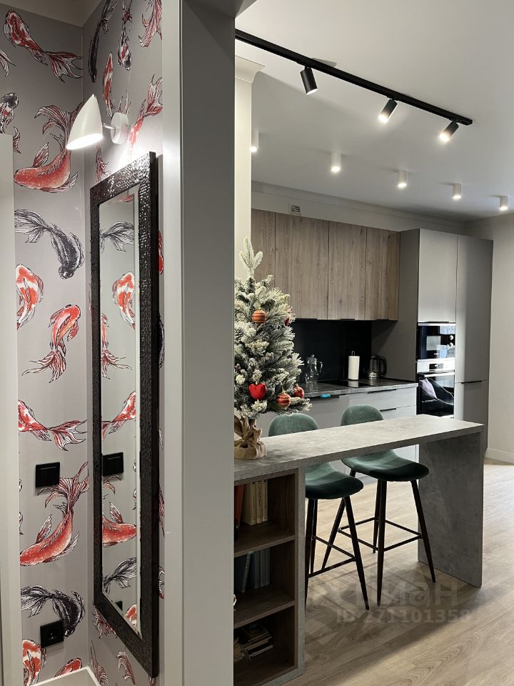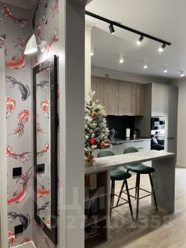В квартире все предусмотрено для комфортного проживания гостей: зона отдыха с двухспальной кроватью и ортопедическим матрасом, отделенная стеклянной раздвижной перегородкой со шторами, зона гостиной с удобным диваном, кухня с обеденным столом и барной стойкой, лоджия с полноценным рабочим местом и уголком отдыха, просторная гардеробная для хранения вещей и багажа.