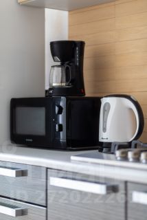 Холодильником, Плитой, Микроволновой печью, Электрическим чайником, Кофеваркой.
