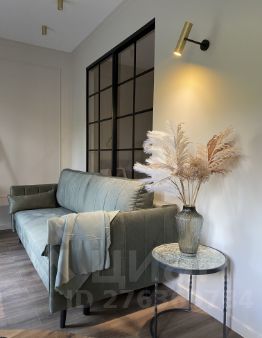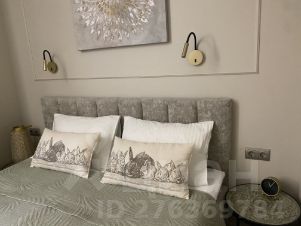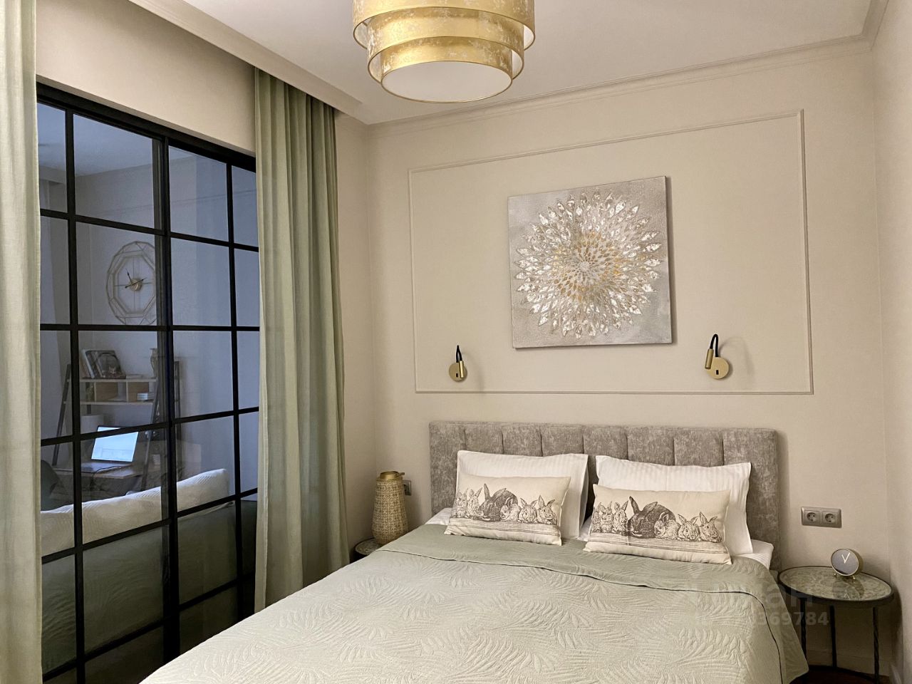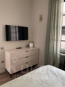В спальне двуспальная кровать, комод с ящиками и телевизор. В зоне гостиной расположен раскладной диван и рабочий столик для ноутбука.