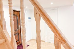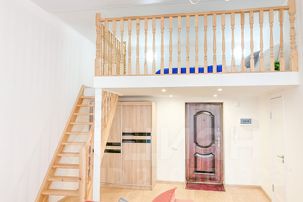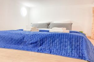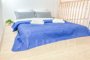 Спальня на втором ярусе - деревянная лестница из апартаментов ведет к невысокой нише с большим двуспальным матрасом с белоснежным постельным бельем. Подойдет для любителей изысканного отдыха либо для деток, любящих штабики. Все постельное белье обрабатывается специальными гипоаллергенными средствами.