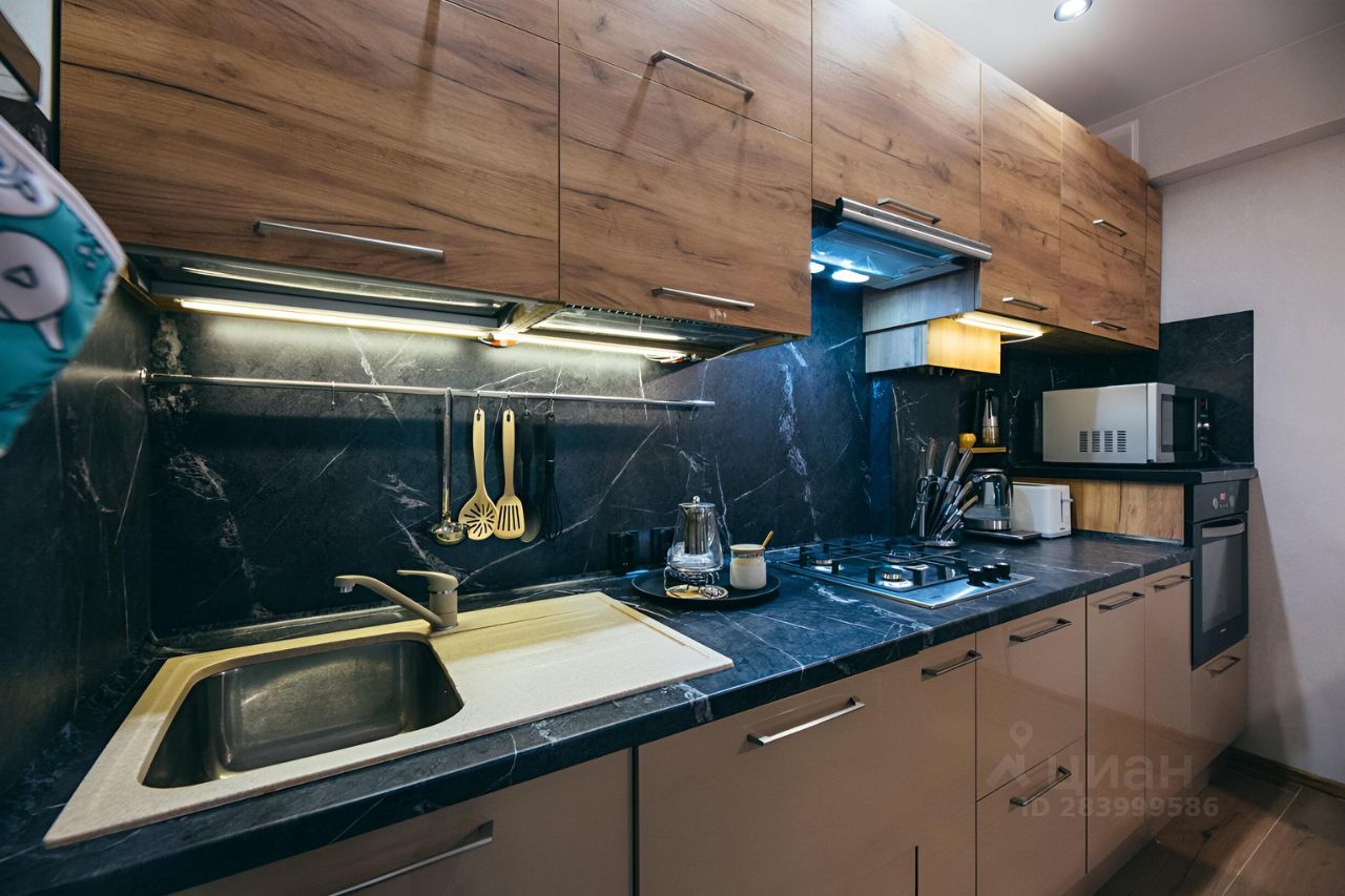 В просторной кухне - столовой (22 кв.м) кухонный уголок, обеденный стол, диван-кровать, гостиный уголок с телевизором. Выход на лоджию.