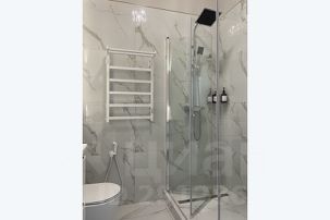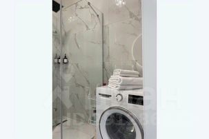 Ванная комната с просторной душевой, гигиеническим душем, стиральной машиной.