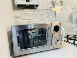 Для готовки доступна кухня с плитой, микроволновкой, электрическим чайником, холодильником и всей необходимой посудой.