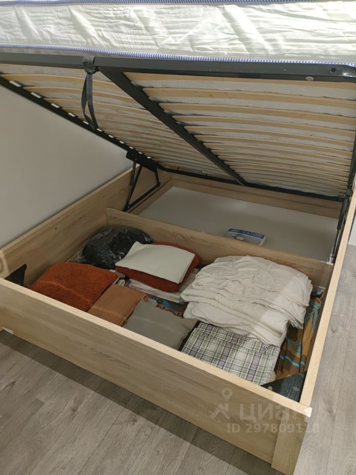 В комнате вместительный стеллаж отделяет большую двуспальную кровать от входа. Кровать большая и удобная, новый матрас, есть комплект белья и подушек, одеял. Под кроватью большое пространство для хранения ваших вещей.
