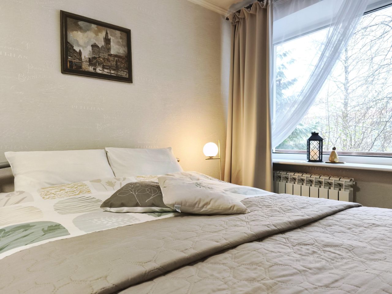 Квартира укомплектована всей необходимой мебелью и техникой для комфортного проживания. Удобная двухспальная кровать, холодильник, микроволновая печь, посуда, стиральная машина, телевизор, wi-fi, полотенца, постельные принадлежности, фен, утюг, гладильная доска.