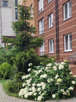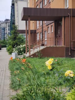 Территория дома облагорожена цветущими цветами, хвойными елями и пышными деревьями. Во дворе дома бесплатная парковка и детская площадка.