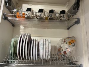 микроволновая печь, кофеварка капельного типа, электрочайник, плита, духовой шкаф, холодильник, посуда, на кухне установлен фильтр для питьевой воды.