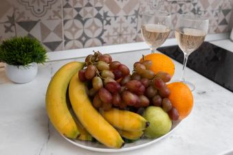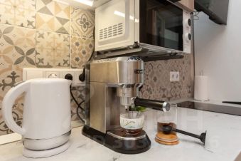 Холодильником, плитой, микроволновой печью, электрическим чайником и кофемашиной, фильтром для воды.