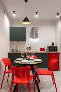 На кухне обеденная зона и зона отдыха с телевизором и удобным диваном, который раскладывается и превращается дополнительное спальное место 140х200 см.