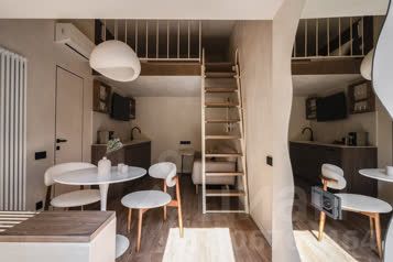 Эта уютная студия с отдельным входом на первом этаже идеально подходит для тех, кто ценит комфорт и удобство. На втором ярусе расположено уютное спальное место, а внизу - удобный раскладной диван, который легко превращается в двуспальную кровать.